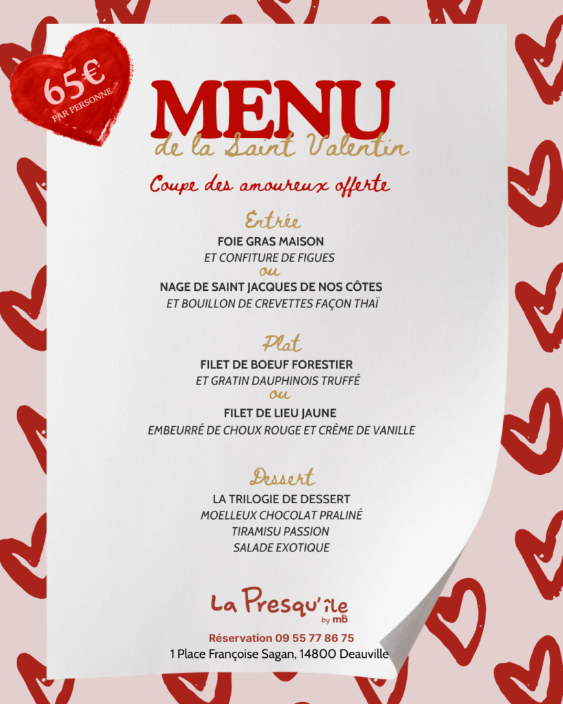À La Presqu’île, restaurant à Deauville, notre menu maison met en valeur les produits frais et de saison. Chaque plat reflète la richesse du marché local pour une expérience gourmande et authentique.